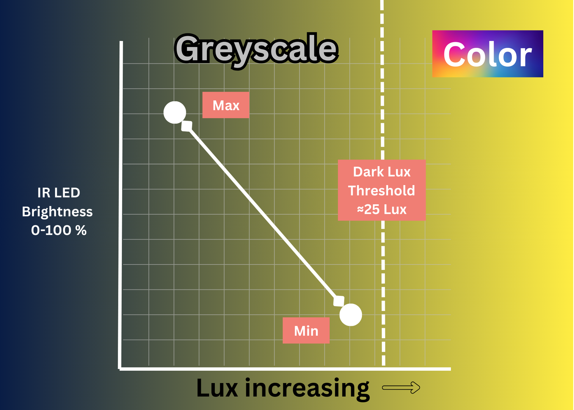 * Si la luz ambiente **cae por debajo de este valor**, la cámara activa el **modo de visión nocturna** (escala de grises) y **habilita el IR**.